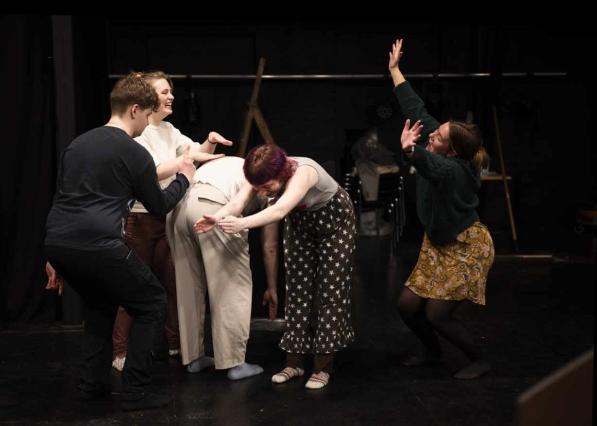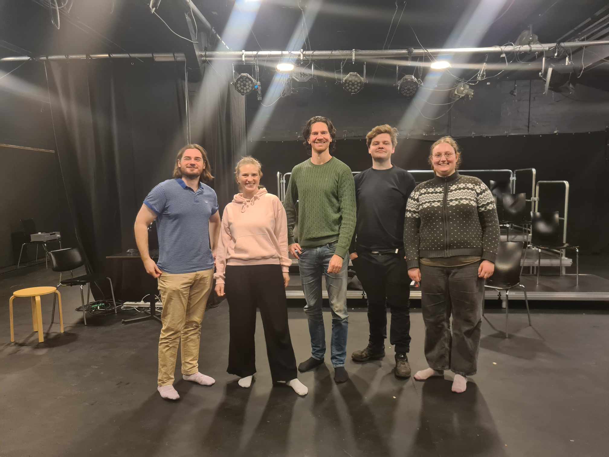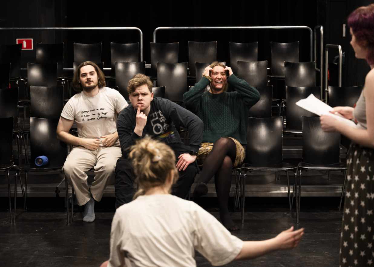 Så tager vi fat i dagens tema, det kan være: Hvordan spiller man en karakter der er 80% menneske og 20% dyr, teknikker til at huske replikker, bevæg din krop som en farve, eller hvad er dit mål i en scene?